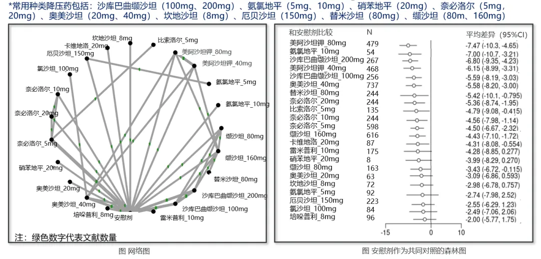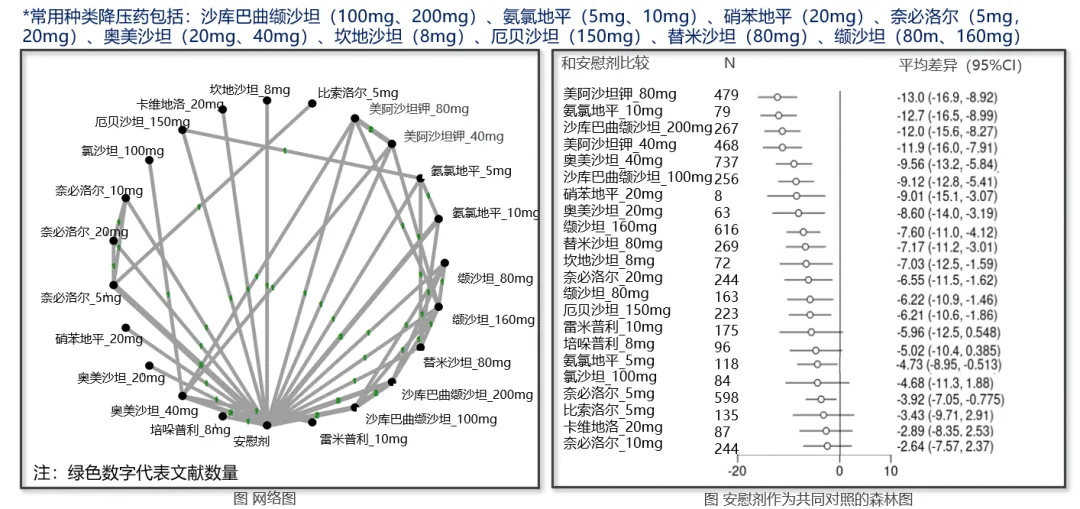 网状荟萃分析结果显示:与安慰剂对照,在常用降压药(ARB、ACEI、ARNI、β-受体阻滞剂、钙通道阻滞剂)中,美阿沙坦钾80mg的诊室收缩压和舒张压降幅均最大;